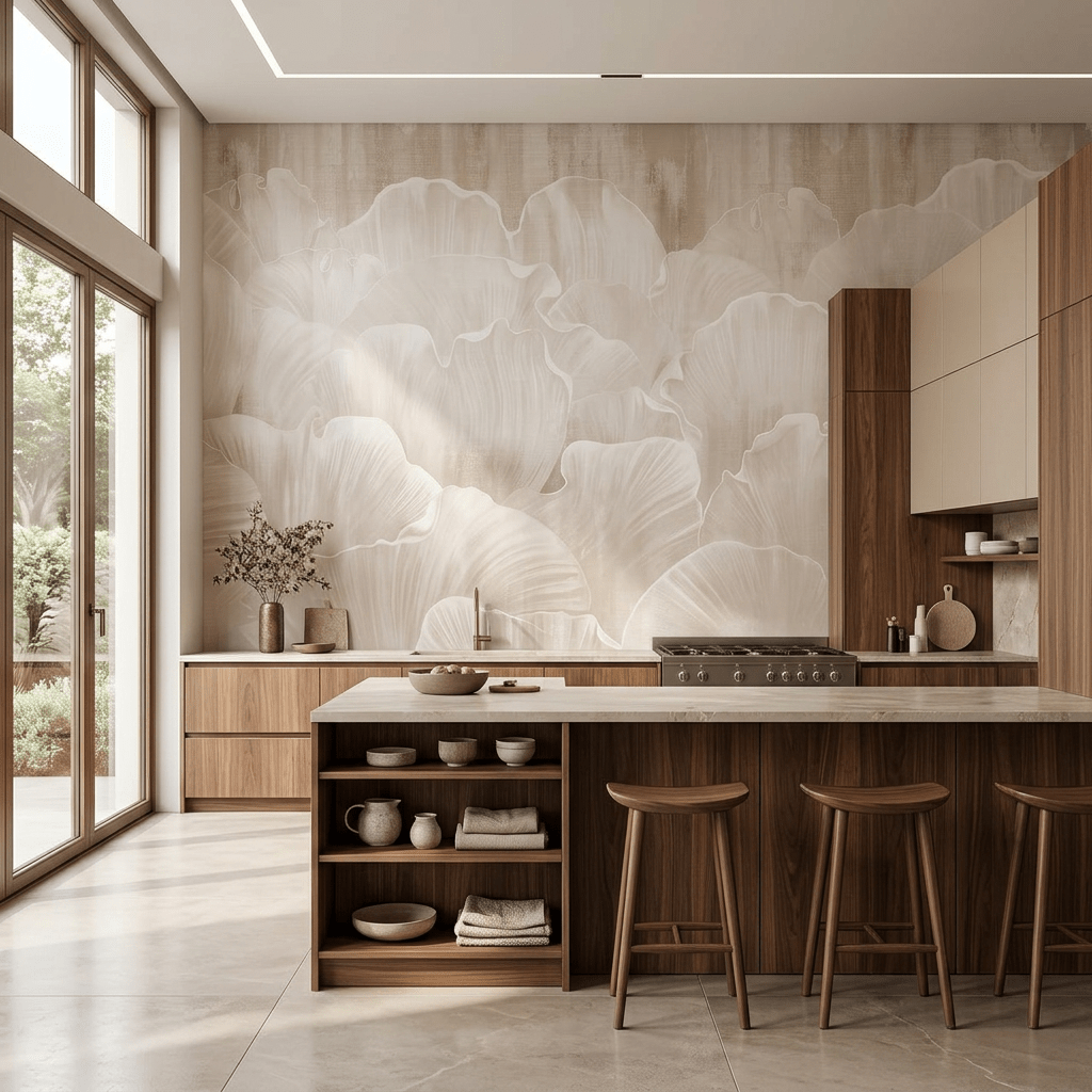 Le papier peint panoramique Voile de Pétales enveloppe l’espace d’une douceur élégante et lumineuse. Son motif floral aérien, composé de larges pétales aux lignes délicates, se déploie dans une palette de beiges poudrés, de sable et d’ivoire pour créer une ambiance apaisante et raffinée. À la fois subtil et décoratif, ce décor mural joue avec les effets de transparence, de matière et de mouvement pour habiller le mur avec légèreté.