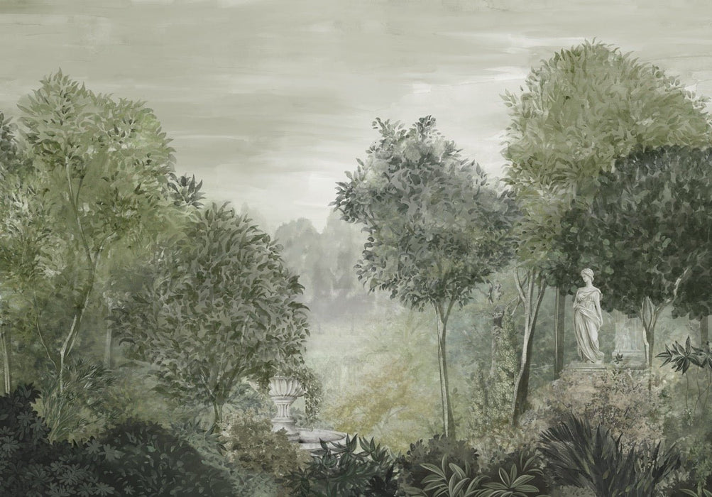 Inspiré des décors muraux des villas italiennes et de l’élégance intemporelle de l’Antiquité, ce papier peint panoramique déploie un paysage délicatement patiné où se mêlent végétation foisonnante, perspective douce et statue classique. Son décor aux nuances naturelles et poudrées crée une atmosphère enveloppante, subtilement théâtrale, qui habille l’espace avec raffinement.