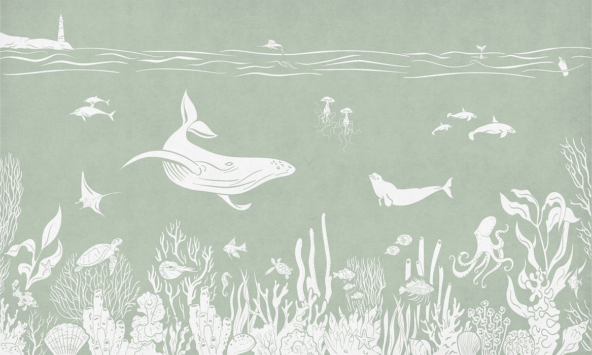La chambre de votre bébé ou de votre enfant se transforme grâce à notre papier peint balade aquatique vert. Ce papier peint vert monochrome, à la couleur pastel, adoucit et apaise l'ambiance de la chambre de votre enfant. Idéal pour l'accompagnement et le développement de l'éveil de votre enfant, ce papier peint enfant animaux marins raconte de tendres histoires. Plongeons ensemble entre les dauphins, les baleines, les poissons et les coraux pour s'émerveiller et apprendre en s'amusant. Le vert de ce papier peint est doux.