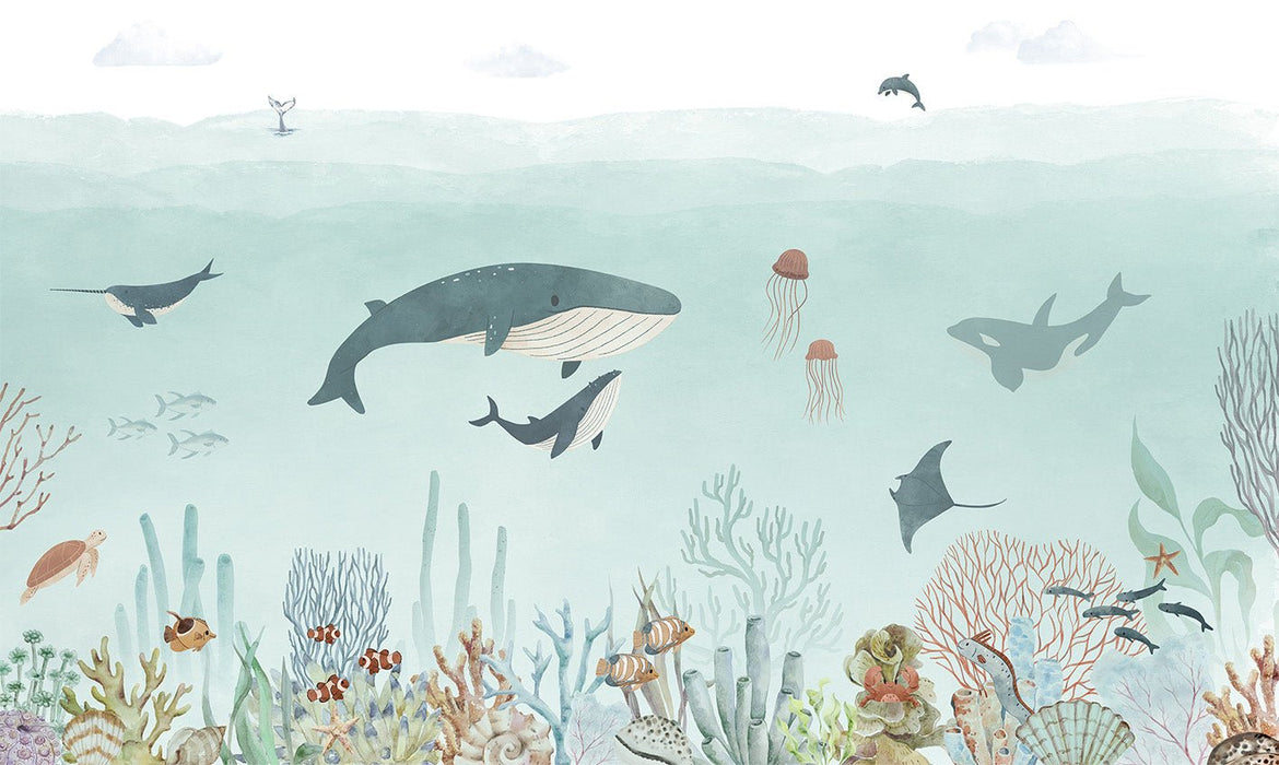 Découvrez à travers ce décor mural XXL un univers marin peuplé de bébés baleines, et poissons joyeux et ludiques. Les dessins charmants et pleins de douceur captiveront l'imagination de votre bébé, rendant chaque instant passé dans sa chambre encore plus magique.