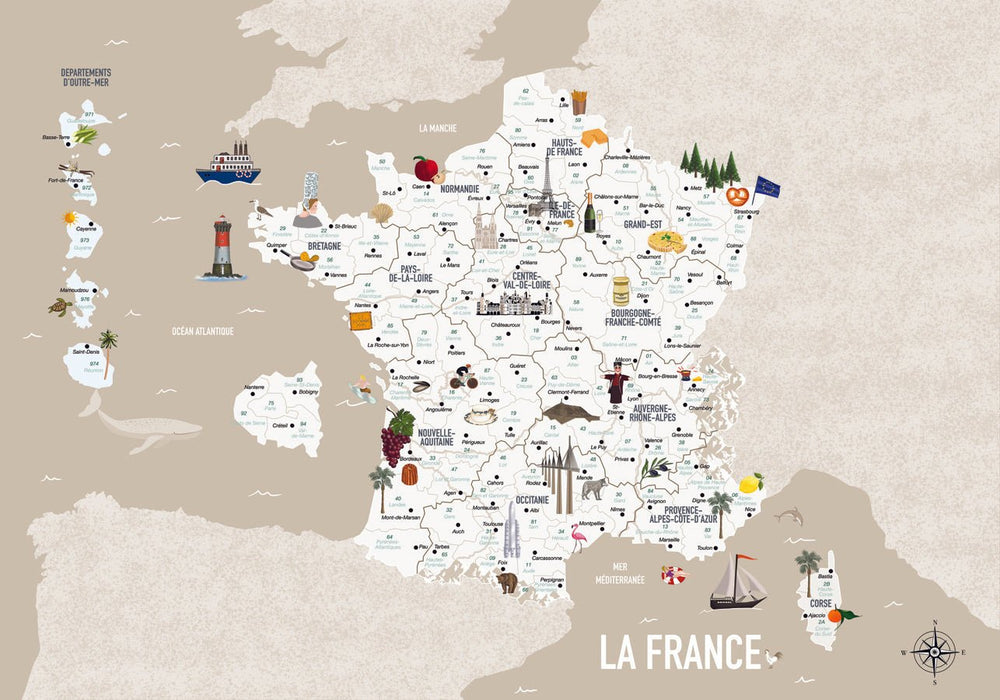 Découvrez notre papier peint carte de France enfant beige. Cette carte de France permet aux petits et grands d'apprendre la géographie de la France facilement. Ce papier peint carte du monde illustré permet de connaître les spécialités des régions ou des départements. Un papier peint ludique, facile d'apprentissage et joliment illustré qui met en lumière toutes les richesses de la France : monuments, alimentation, montagnes, fleuves, département d'outres mer… Comment ne pas craquer pour cette fresque murale carte de France ? Ce décor panoramique est d'un style doux, scandinave, proposé en trois couleurs. Il est idéal pour créer une atmosphère relaxante, propice à l'endormissement, mais aussi bien pensé pour faciliter l'apprentissage et donner l'envie à toute la famille de découvrir les quatre coins de la France. Créez facilement une décoration unique avec ce papier peint sur mesure ! Comme nous sommes convaincus que vous allez l'adorer. Tous nos papiers peints sont Eco-friendly, Kids Friendly. Ils sont respectueux de l'environnement et des intérieurs. Posez ce papier peint panoramique carte de France dans la chambre de votre enfant, dans une salle de jeux ou encore dans une salle de classe ! Les enfants seront émerveillés.