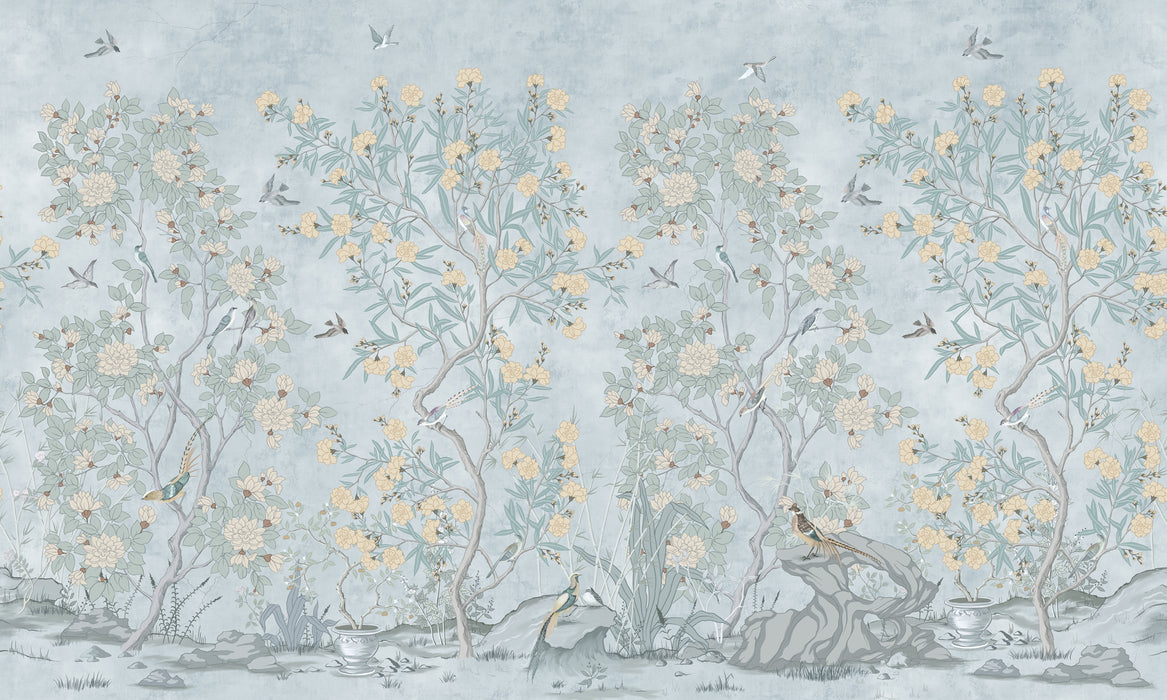 Ce papier peint chinoiserie représente un décor végétal et floral, avec des couleurs douces et pastels. Les oiseaux accompagnent ce tableau pour donner de la douceur et de l'originalité.