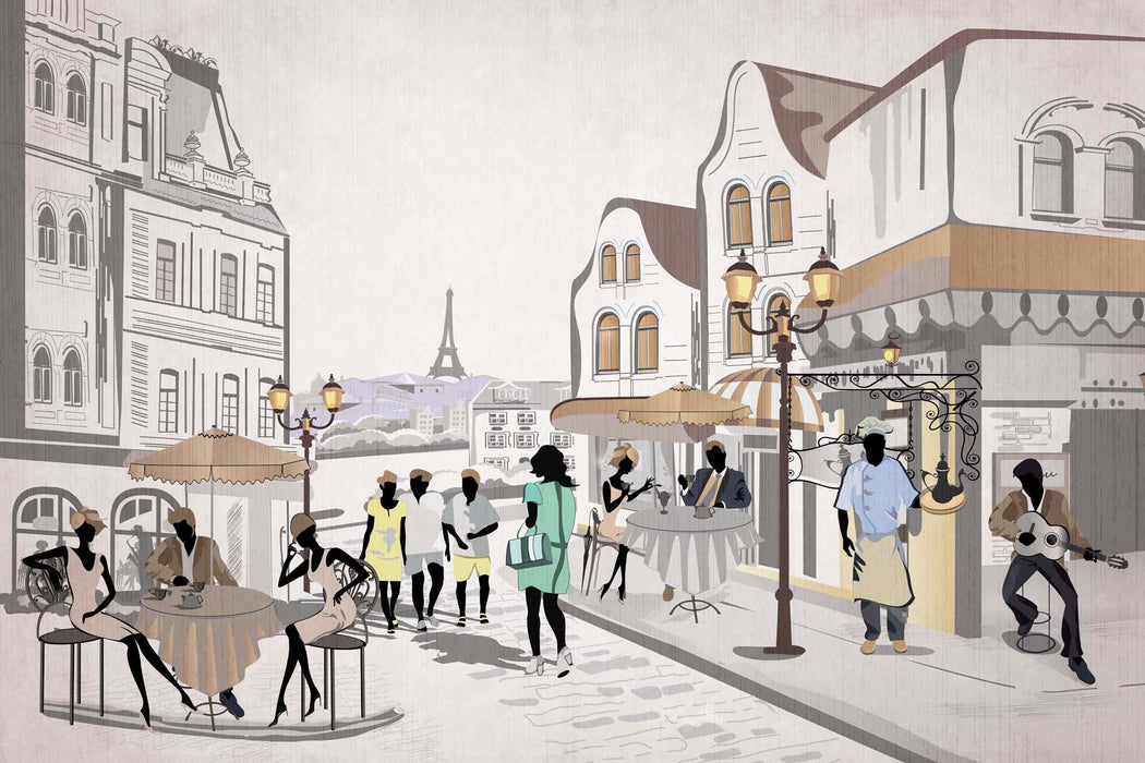 Le papier peint intissé français Paris café en terrasse de la lumière et de l'élégance dans votre intérieur. Une vue sur un quartier chic jazzy, un papier peint vue sur la tour Eiffel. Son motif dynamique apportera de la perspective à votre pièce. Un décor mural panoramique qui impressionnera vos invités. Créer facilement un intérieur unique avec notre papier peint intissé réalisé sur mesure. (Coloris des personnages peuvent être modifiés sur demande par mail).