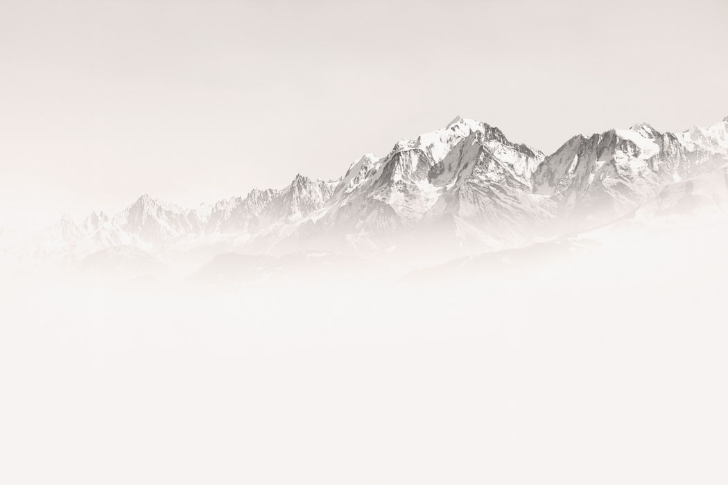 Ce paysage panoramique montagneux et brumeux vous invite dans une atmosphère paisible et sereine. Créer une ambiance inspirante et reposante avec notre papier peint photo matin brumeux Mont Blanc réalisé sur mesure.