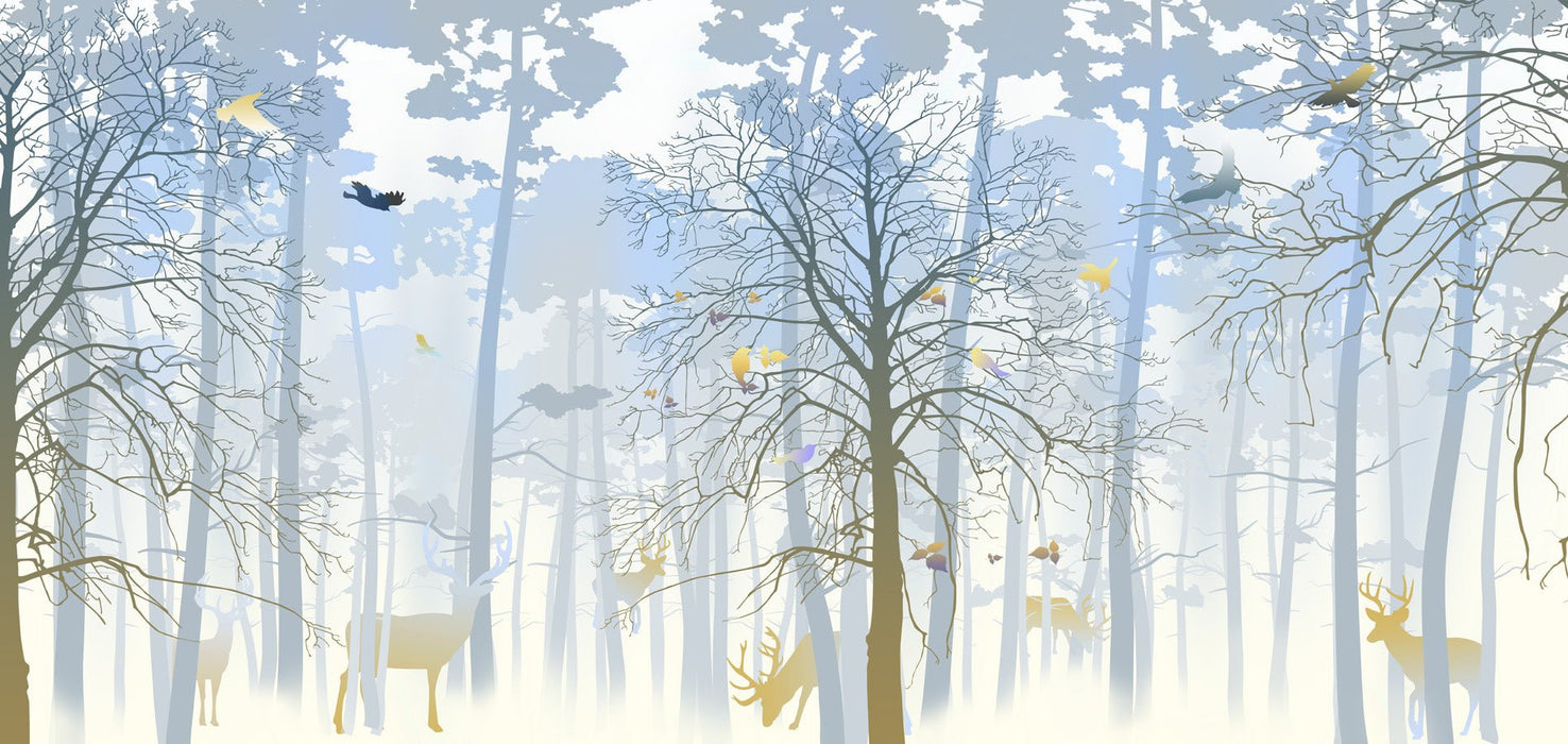 Collection exclusive papier peint panoramique intissé tendance forêt, biches, cerfs.