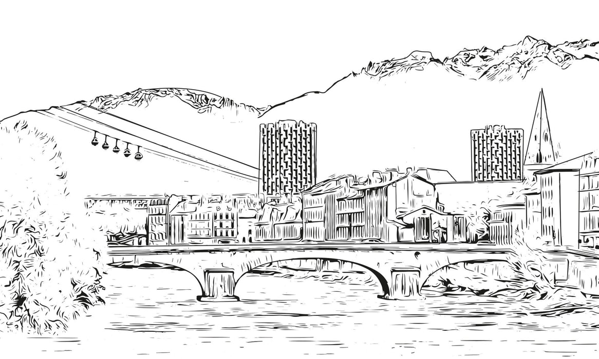 Ce papier peint illustré en noir et blanc représente une vue emblématique de Grenoble, une ville nichée au cœur des Alpes françaises. On y distingue plusieurs éléments caractéristiques :