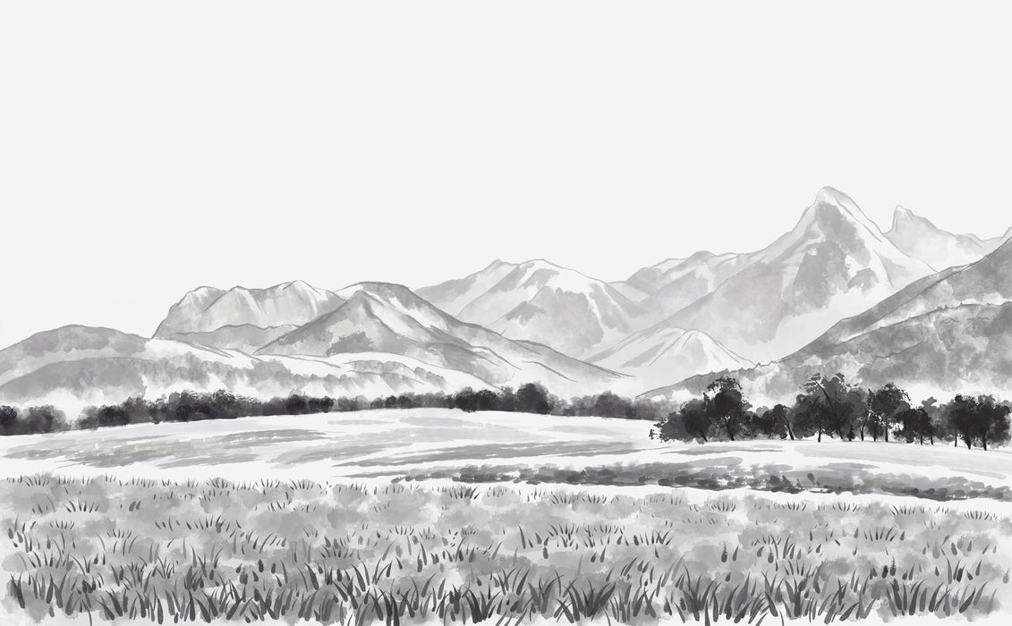 Ce papier peint panoramique montagne représente une vue artistique et épurée du massif des Mémises, sommet emblématique dominant le Chablais alpin, face au Léman, à la frontière des Alpes françaises et suisses. Reconnaissable à sa ligne de crête douce et étirée, le mont des Mémises se détache ici dans une interprétation noir et blanc élégante, sublimée par des prairies alpines et une lisière forestière au premier plan.