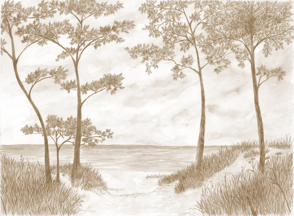 Offrez à vos murs une œuvre murale prestigieuse et intemporelle. Commandez dès maintenant votre papier peint panoramique sépia inspiré de la Côte Basque et des Landes, une création unique de l’artiste Flora Lacour Filliol.