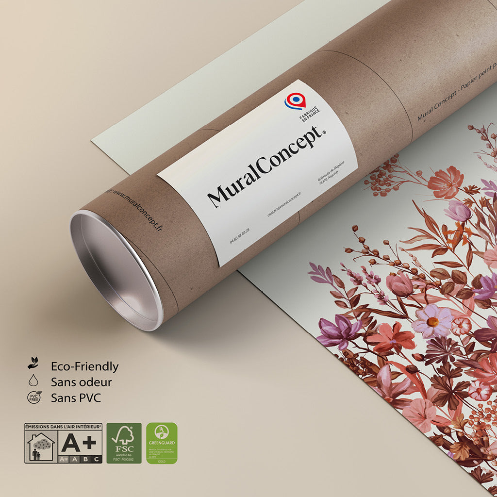 Laissons la pollution en dehors de nos murs. Nos papiers et nos encres ne rejettent aucune émission nocive pour votre air intérieur (certification UL ECOLOGO® et UL GREENGUARD GOLD). Nous ne produisons que la quantité de papier nécessaire à votre mur.