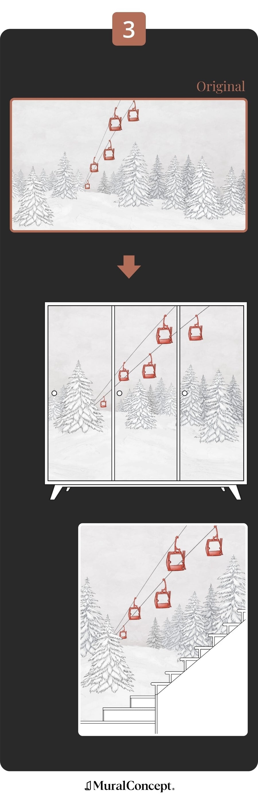 Notre studio design peut modifier l'image pour l'ajuster à vos contraintes d'agencement : tête de lit, mansarde, cage d'escalier, etc.