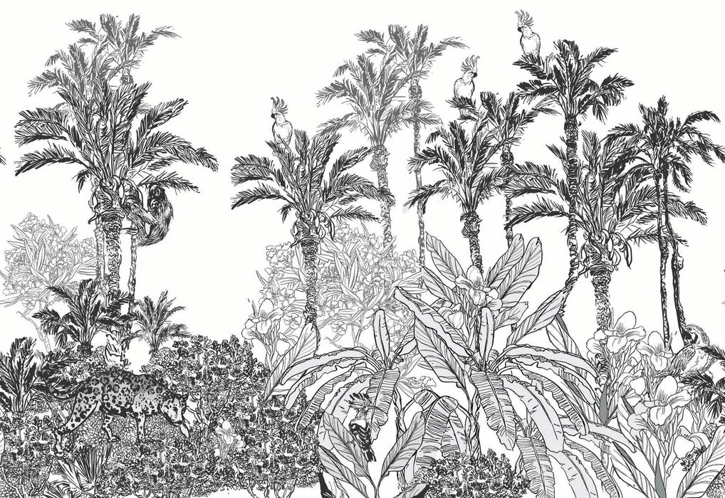 Sur ce papier peint, vous trouverez une multitude d'animaux de la jungle, tels que la panthère, le perroquet, l'oiseau et le singe, qui se fondent harmonieusement dans le décor. Les nuances de gris viennent adoucir les traits noir et blanc, créant un contraste saisissant et élégant.