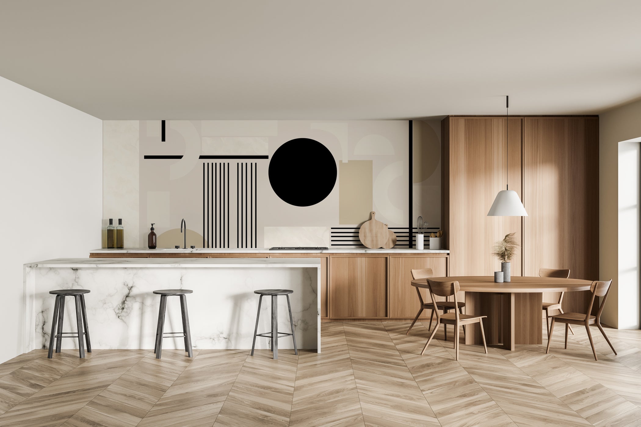 Un papier peint trompe-l’œil design, mêlant béton, onyx et marbre pour créer un décor unique et résolument tendance.